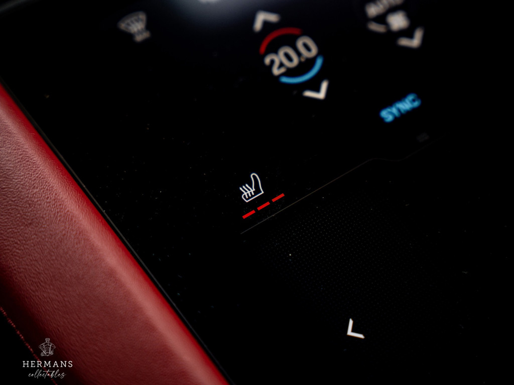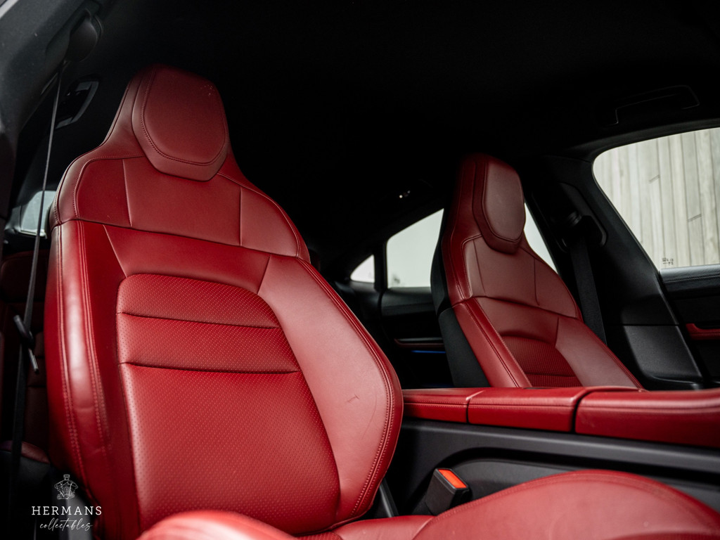 Deze rijk uitgeruste Porsche in het ‘Dolomietzilver Metallic (LM7P)" met het "Bordeax rood" met "Schwarz" lederen interieur en rode remzadels achter de 21" Taycan Exclusive Design wielen.