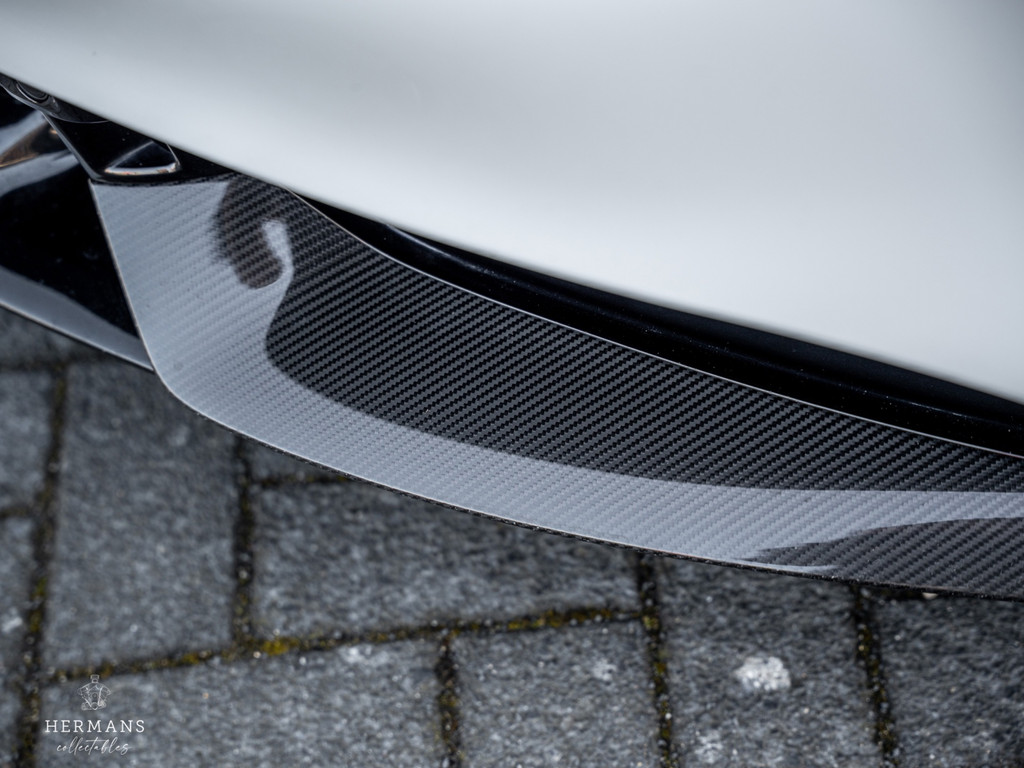 De Porsche is geleverd in de kleur "Carreraweiss Metallic" (LC9X), carbon in- & exterieurafwerking, zwart lederen bekleding en Keramische remschijven achter de zwarte 21" Mission E Design wielen.